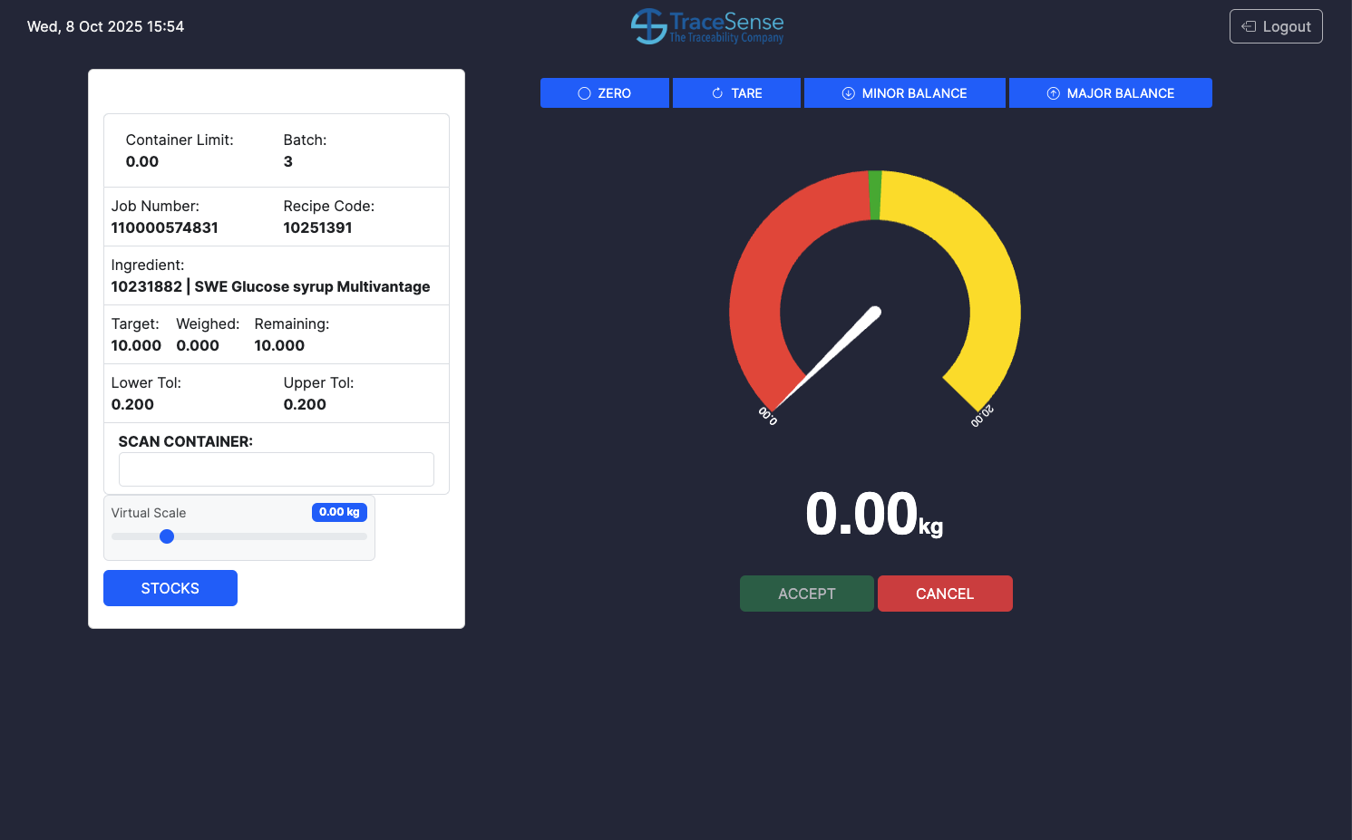 The TraceSense system enforces individual ingredient tolerances with a visual green speedometer-style indicator, preventing operators from proceeding until all ingredients are accurately weighed.